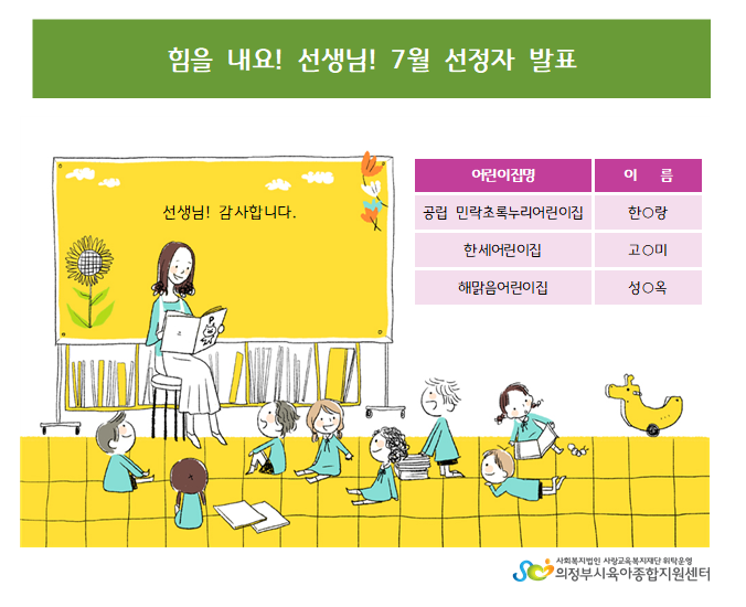 보육교직원 직무스트레스 완화 프로그램 「힘을 내요! 선생님」 8월 선정자 발표 > 공지사항