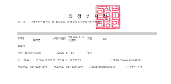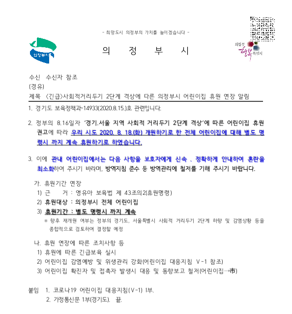 의정부시 관내 어린이집 휴원 연장 안내 페이지 정보 작성자 의정부센터 댓글 0건 조회 3,941회 작성일 2020-08-16 12:16 본문 경기도에서 사회적거리두기 2단계 격상에 따라 어린이집 휴원을 무기한 연장하였고 이와 관련 의정부시에서 시행한 공문 게시해 드리오니, 참고하시기 바랍니다. 목록 이전글의정부시육아종합지원센터 최종 합격자 발표(운영보조) 20.08.18 다음글1차 서류전형 합격자 안내(운영보조) 20.08.13