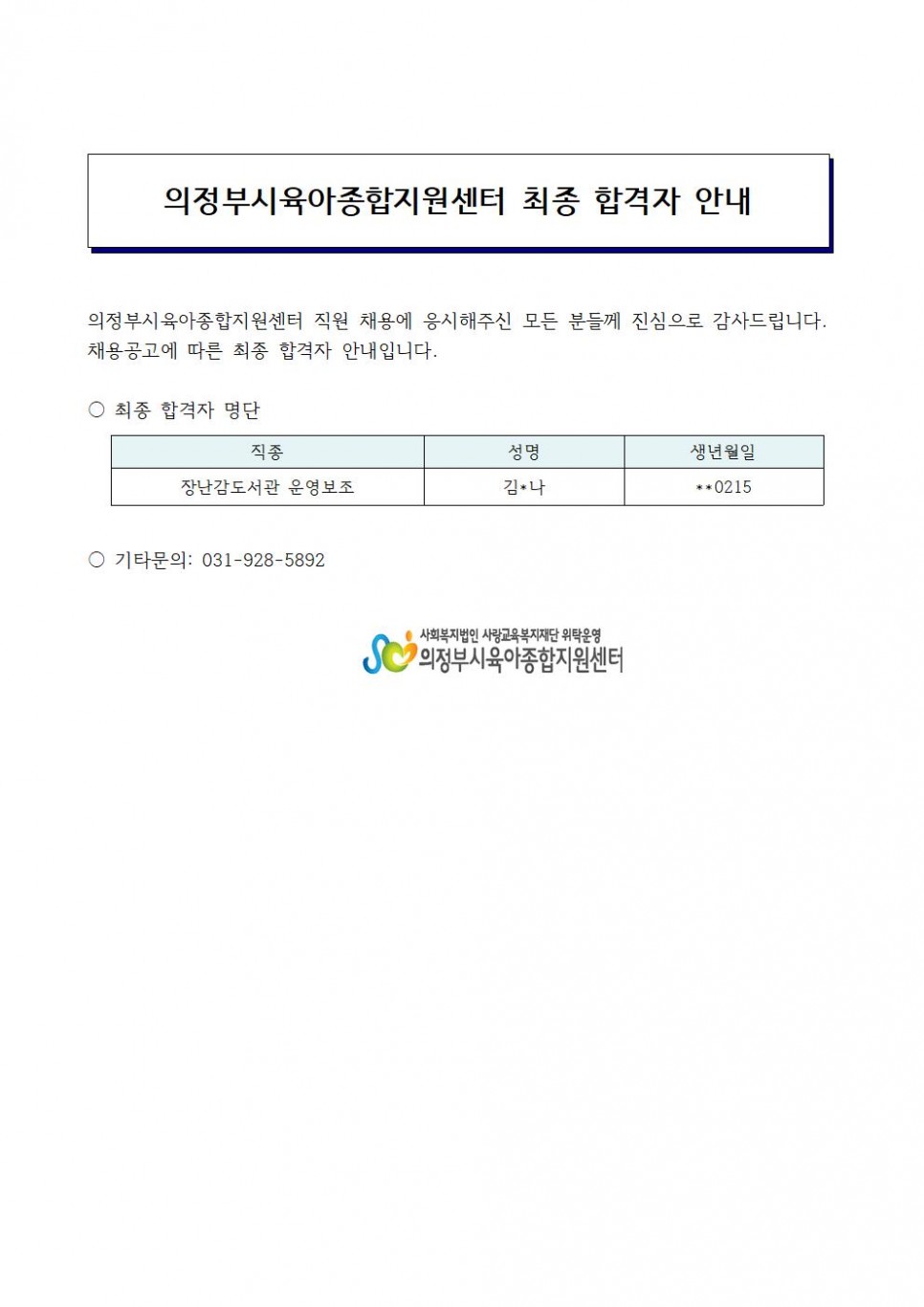 의정부시육아종합지원센터 최종 합격자 발표(운영보조) 페이지 정보 작성자 의정부센터 댓글 0건 조회 3,212회 작성일 2020-08-18 14:21 본문 의정부시육아종합지원센터 최종 합격자 발표(운영보조) 목록 이전글3분기 어린이집 대상 놀이실 신청 연기 20.08.20 다음글의정부시 관내 어린이집 휴원 연장 안내 20.08.16