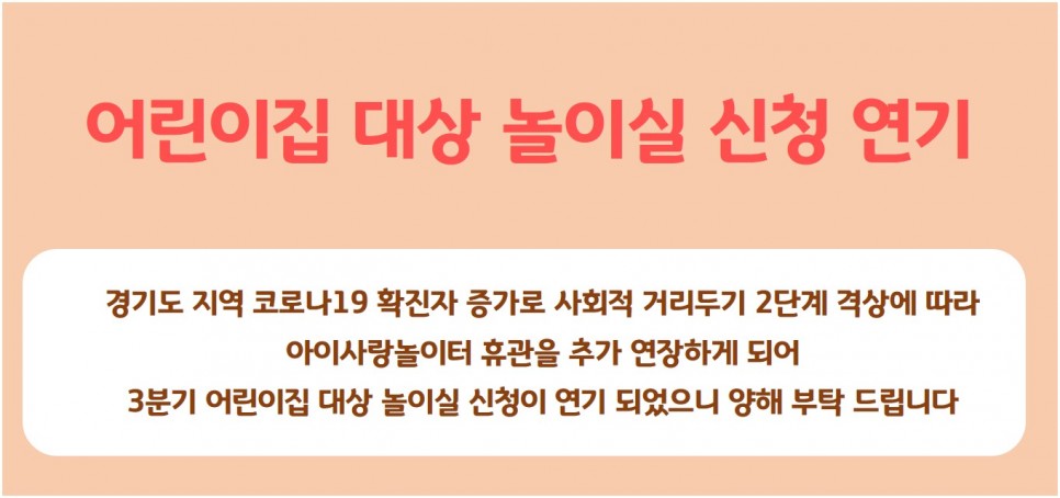 3분기 어린이집 대상 놀이실 신청 연기 페이지 정보 작성자 의정부센터 댓글 0건 조회 2,591회 작성일 2020-08-20 16:02 본문 *해당시설 - 아이사랑놀이터 민락점, 의정부점 목록 이전글제4차 어린이집 표준보육과정 해설서 및 고시문 20.08.24 다음글의정부시육아종합지원센터 최종 합격자 발표(운영보조) 20.08.18