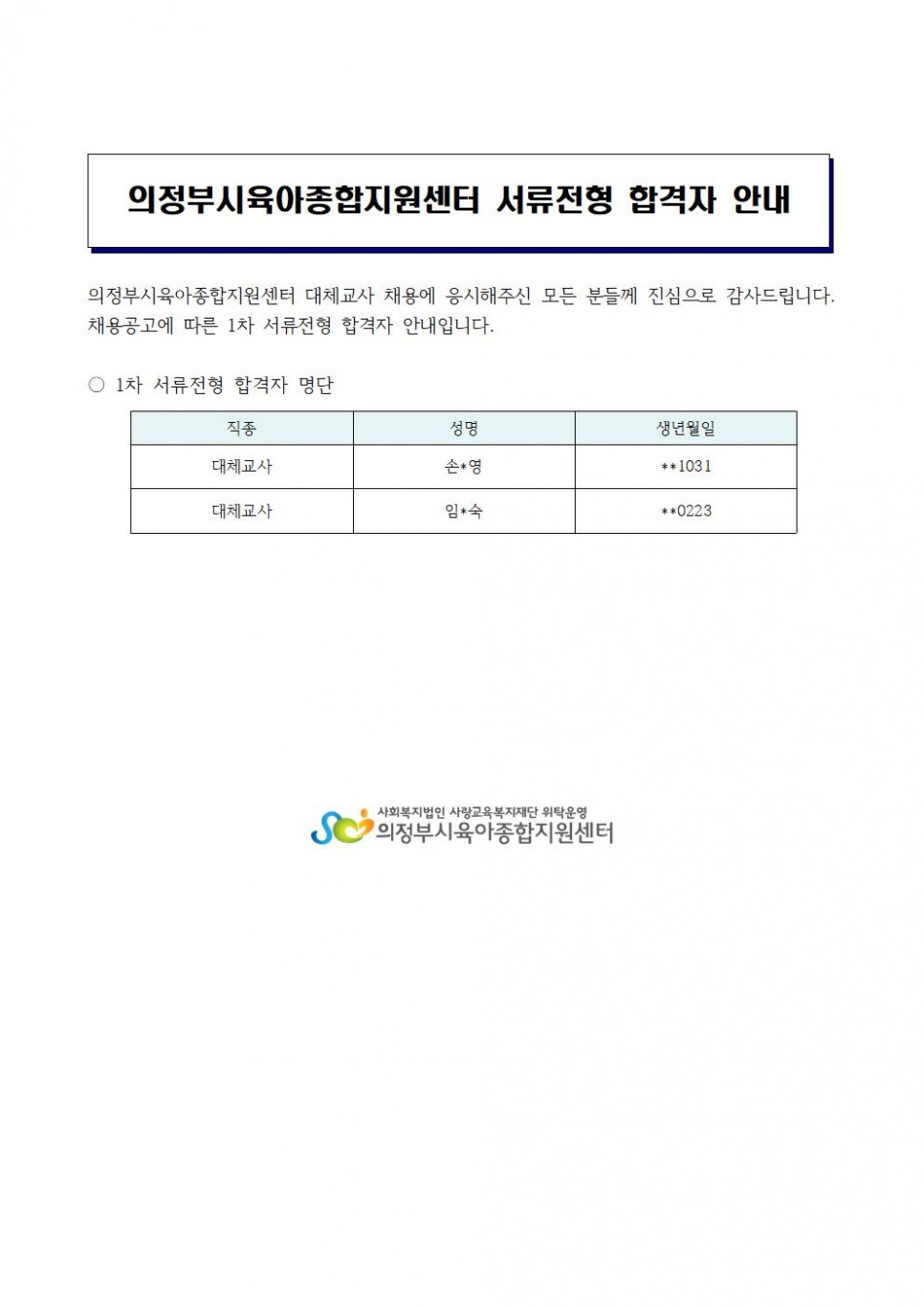 의정부시육아종합지원센터 서류합격자 발표(대체교사) 페이지 정보 작성자 의정부센터 댓글 0건 조회 2,709회 작성일 2020-08-25 16:12 본문 의정부시육아종합지원센터 서류합격자 발표(대체교사) 목록 이전글코로나19 대응에 따른 어린이집 평가일정 조정 안내 (20. 8. 21. 한국보육진흥원) 20.08.26 다음글2020년 「온택트 유아환경연수」 운영 안내 20.08.24