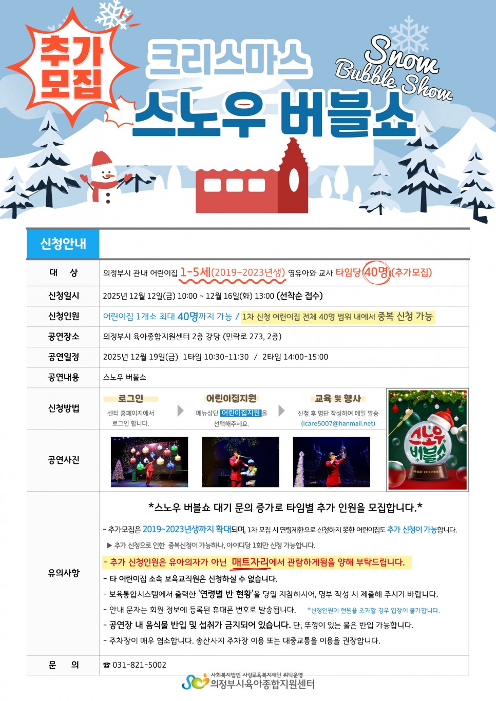 [추가모집] 크리스마스 '스노우 버블쇼' 페이지 정보 작성자 의정부센터 댓글 0건 조회 273회 작성일 2025-12-11 14:54 본문 * 1타임 신청링크 : https://icare.or.kr/bbs/board.php?bo_table=s3_1_2&wr_id=1869&mode=&year=2025&month=12* 2타임 신청링크 : https://icare.or.kr/bbs/board.php?bo_table=s3_1_2&wr_id=1870 목록 이전글[채용] 의정부시육아종합지원센터 2026년 토요일 아르바이트(모두의 놀이터) 채용 공고 25.12.19 다음글[동두천시육아종합지원센터] 직원 채용 공고(놀이지도사) 25.12.03