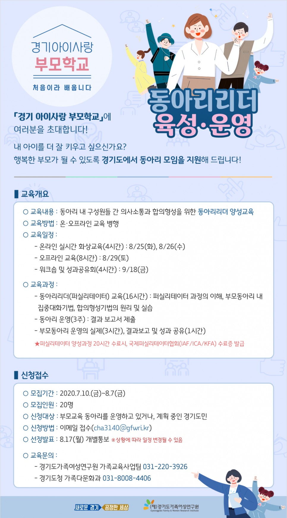 [경기도가족여성연구원] 경기아이사랑 부모교육 동아리 리더 육성, 운영 참여자 모집 공고 페이지 정보 작성자 의정부센터 댓글 0건 조회 3,110회 작성일 2020-07-07 20:28 관련링크 https://bit.ly/2AzaKSg 1332회 연결 본문 상단의 관련링크를 클릭하시면 '경기도가족여성연구원' 홈페이지로 이동합니다. 목록 이전글퍼니홈 극장 '요리쿡 과학쿡' 시청 및 이벤트 참여 안내 20.07.13 다음글바른 인성을 위한 유아인성 교육동화 지식(GSEEK) 신규 개설과정 안내 20.07.06