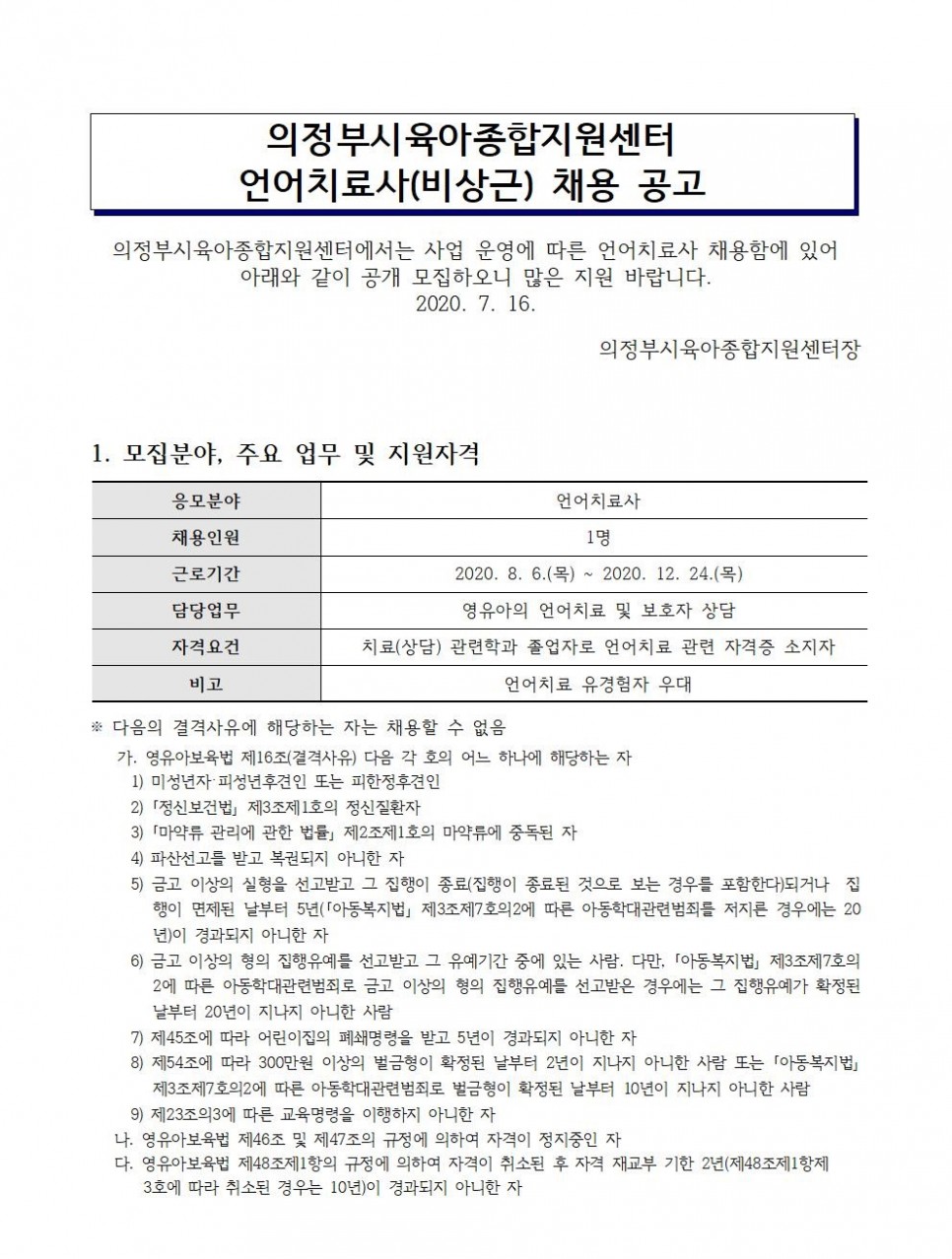 의정부시육아종합지원센터 언어치료사(비상근) 채용 공고 > 공지사항