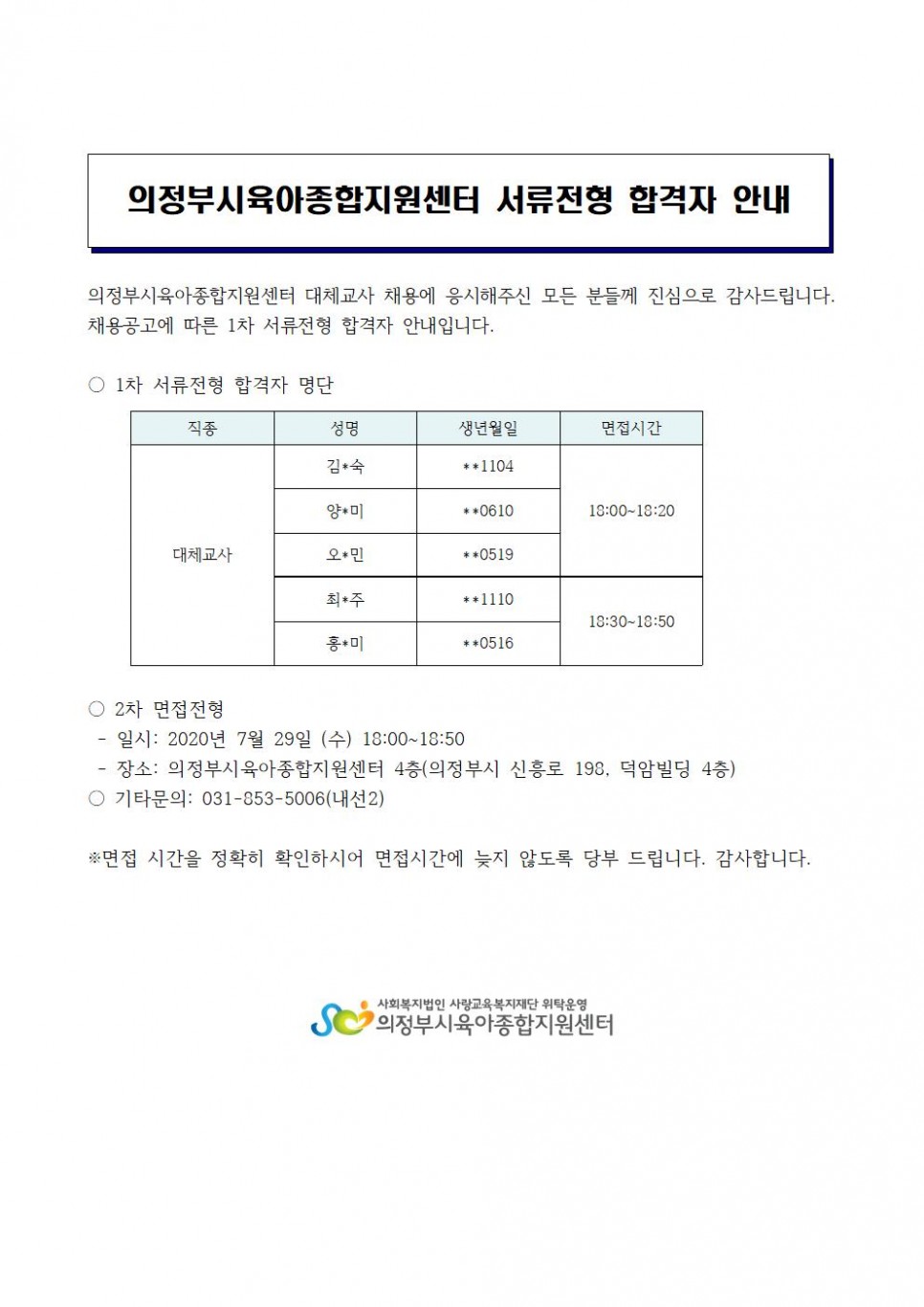 의정부시육아종합지원센터 서류합격자 발표(대체교사) 페이지 정보 작성자 의정부센터 댓글 0건 조회 2,612회 작성일 2020-07-22 08:48 본문 의정부시육아종합지원센터 서류합격자 발표(대체교사) 목록 이전글코로나19 유행대비 어린이집용 대응지침(V-1판) 안내 20.07.23 다음글조선미 교수와 함께하는 아동학대예방 부모교육 '올바른 훈육' 안내 20.07.21