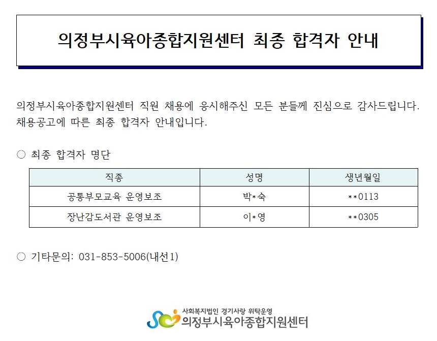 의정부시육아종합지원센터 직원 채용 최종 합격자(운영보조) > 공지사항