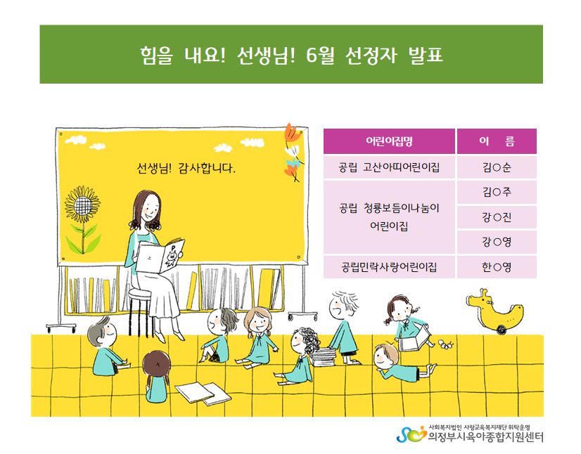 보육교직원 직무스트레스 완화 프로그램 '힘을 내요! 선생님' 6월 선정자 발표 페이지 정보 작성자 의정부센터 댓글 0건 조회 3,632회 작성일 2020-07-04 20:04 본문 보육교직원 직무스트레스 완화 프로그램 '힘을 내요! 선생님' 6월 선정자 발표 목록 이전글바른 인성을 위한 유아인성 교육동화 지식(GSEEK) 신규 개설과정 안내 20.07.06 다음글의정부시육아종합지원센터 2020년도 대체교사 채용 공고 20.07.03