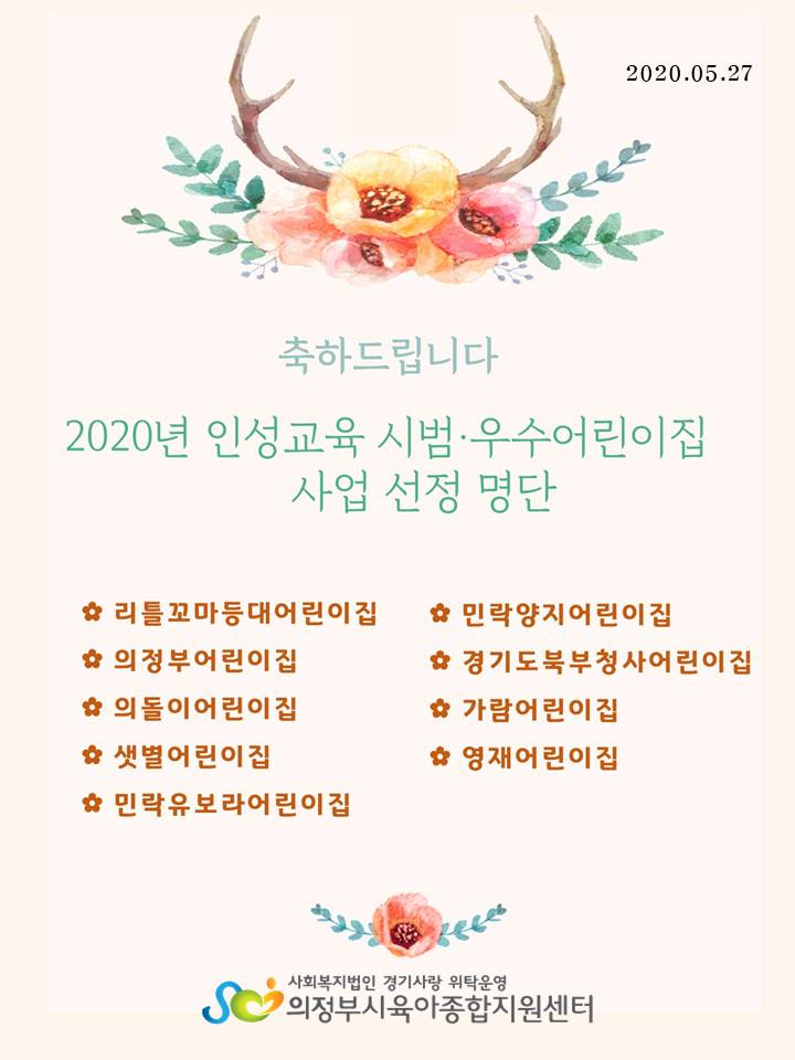 2020년 인성교육 시범우수어린이집사업 선정명단 페이지 정보 작성자 의정부센터 댓글 0건 조회 2,885회 작성일 2020-05-27 11:09 본문 2020년 인성교육 시범우수어린이집사업 선정명단 목록 이전글[의정부점] 2분기(6월) 아이사랑놀이터 놀이실 신청 안내 20.05.28 다음글2020년 경기도 영유아 인성교육 아이디어 공모 안내 20.05.22