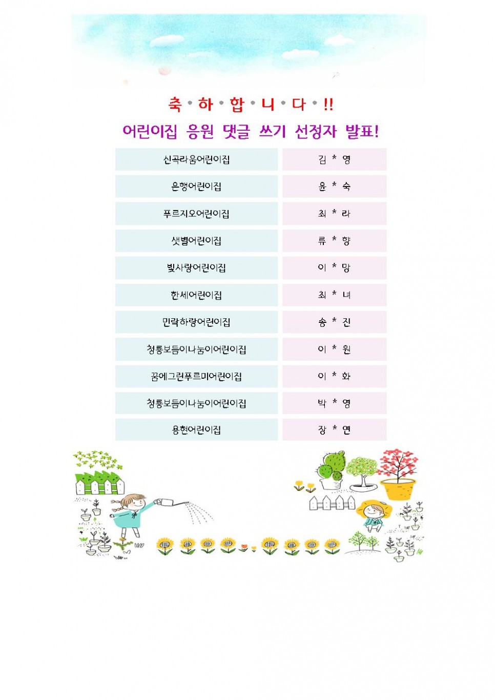 어린이집 응원 댓글쓰기 '힘을 내요! 어린이집! 선정자 발표 > 공지사항
