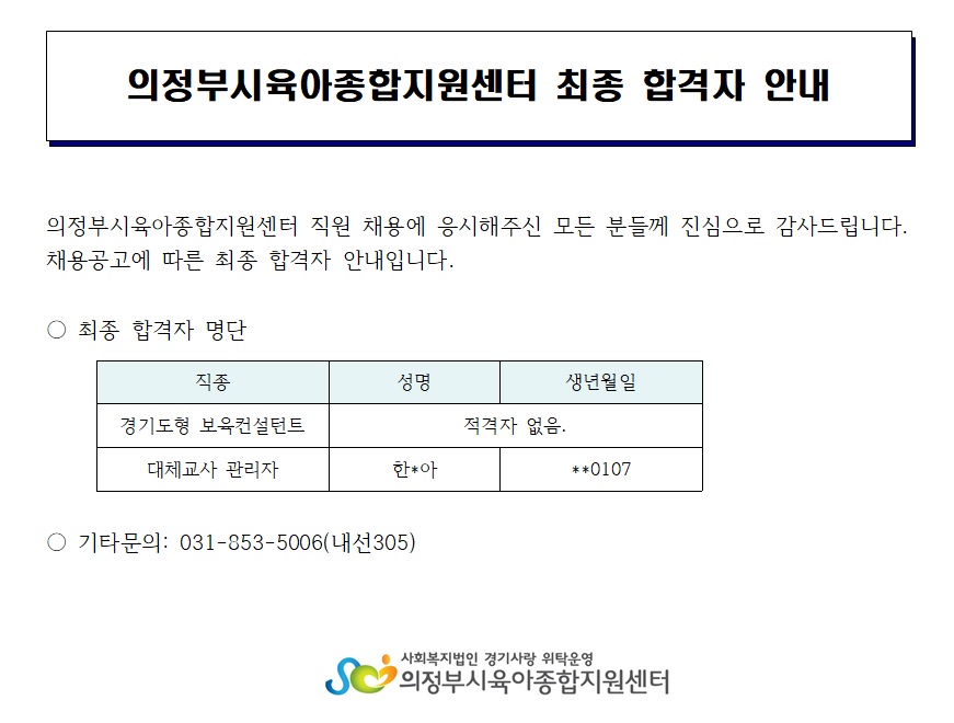 의정부시육아종합지원센터 최종 합격자 안내(경기도형 보육컨설턴트, 대체교사 관리자) 페이지 정보 작성자 의정부센터 댓글 0건 조회 2,716회 작성일 2020-04-23 09:19 본문 의정부시육아종합지원센터 최종 합격자 안내(경기도형 보육컨설턴트, 대체교사 관리자) 목록 이전글2020년 노인학대 예방을 위한 아동 효행교육 사업 안내 20.04.23 다음글남양주시육아종합지원센터장 신규채용 모집공고 20.04.21