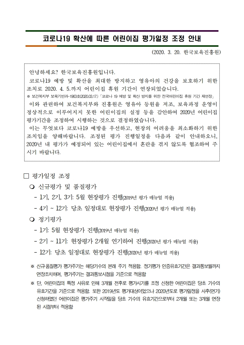 코로나19 감염자 확산에 따른 어린이집 휴원 등에 따라 조정된 평가일정을 안내드립니다.