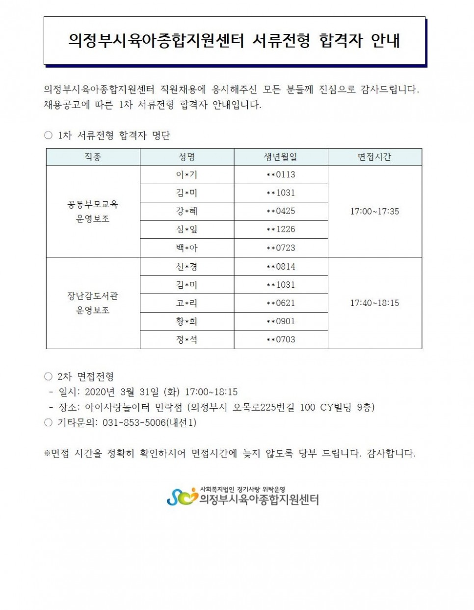 의정부시육아종합지원센터 서류전형 합격자 안내(운영보조)