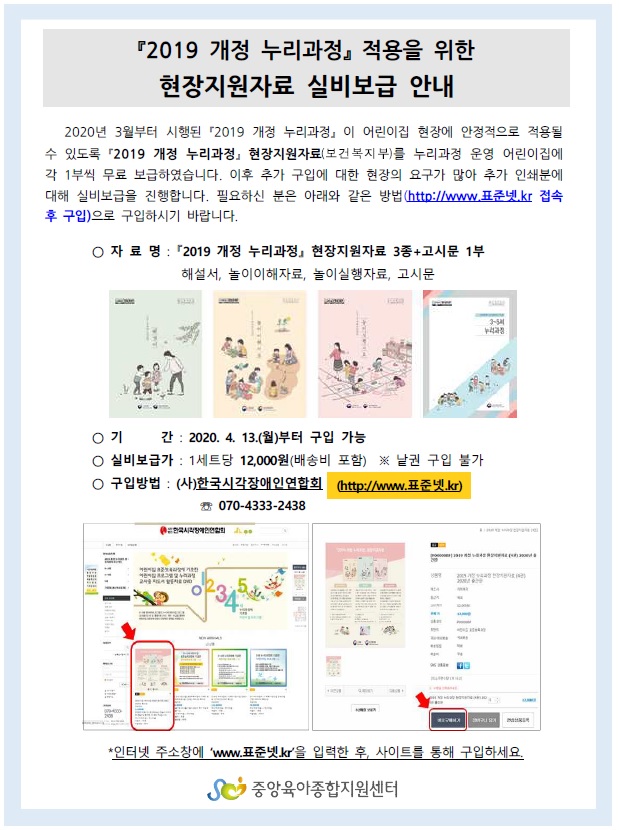2019 개정 누리과정 현장지원자료 실비보급 안내 페이지 정보 작성자 의정부센터 댓글 0건 조회 3,346회 작성일 2020-04-09 13:53 본문 2019 개정 누리과정 현장지원자료 실비보급 안내 목록 이전글제6회 도담아이 사진 공모전 (~ 20.4.30.연장) 20.04.09 다음글2020년 의정부시 열린어린이집 선정기준 20.04.06