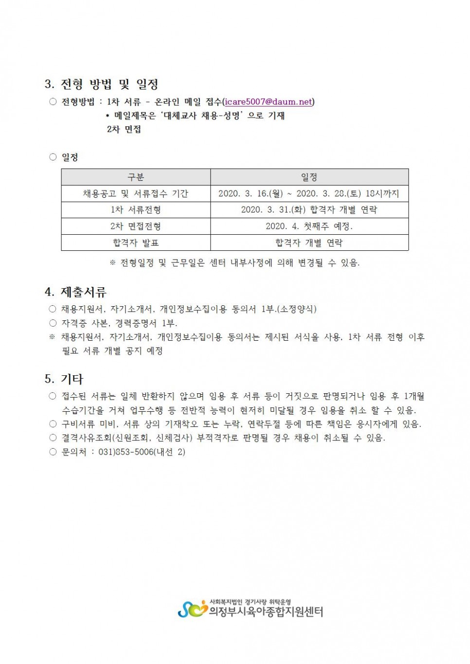 의정부시육아종합지원센터 2020년도 대체교사 채용 공고 페이지 정보 작성자 의정부센터 댓글 0건 조회 3,193회 작성일 2020-03-14 14:27 본문 의정부시육아종합지원센터 2020년도 대체교사 채용 공고문을 게시하오니 많은 지원 바랍니다. 목록 이전글육아정보지 아자 42호(봄호) 신청 안내 20.03.16 다음글[경기도사회서비스원] 2020년 제1차 직원(원장, 돌봄교사) 공개채용 공고 20.03.13