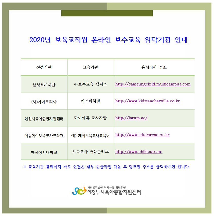 2020년 보육교직원 온라인 보수교육 위탁기관 안내 페이지 정보 작성자 의정부센터 댓글 0건 조회 2,728회 작성일 2020-03-20 11:01 본문 2020년 보육교직원 온라인 보수교육 위탁기관 안내 목록 이전글코로나바이러스감염증-19 유행대비 어린이집 대응지침(Ⅳ판) 20.03.20 다음글의정부시 공립어린이집 4개소 위탁운영체(자) 모집 공고 20.03.19