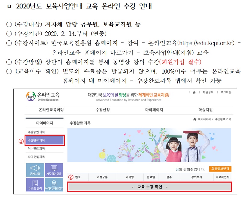 2020년도 보육사업안내 교육 온라인 수강 안내 페이지 정보 작성자 의정부센터 댓글 0건 조회 2,894회 작성일 2020-02-17 10:20 본문 온라인 수강 > https://edu.kcpi.or.kr 목록 이전글2019년 어린이집 평가제 4기 결과발표 20.02.17 다음글보육자료실 이용 안내 20.02.14