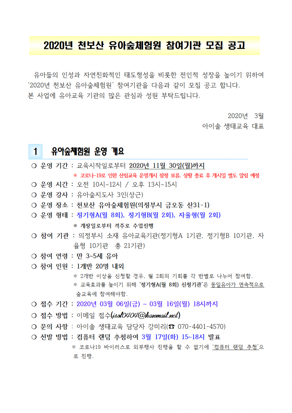 「2020년 천보산 유아숲체험원」 참여기관 모집 공고 페이지 정보 작성자 의정부센터 댓글 0건 조회 3,167회 작성일 2020-03-09 10:28 본문 「2020년 천보산 유아숲체험원」 참여기관 모집 공고 목록 이전글[동부보건소]2020년 어린이 성교육 프로그램 안내 20.03.09 다음글3월 "힘을 내요! 선생님" 선정 공지 안내 20.03.05