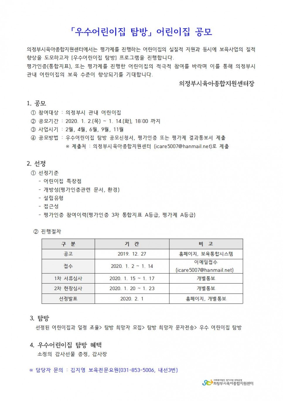 2020년 평가제 관련 [우수어린이집 탐방] 대상 어린이집 모집 공고 > 공지사항