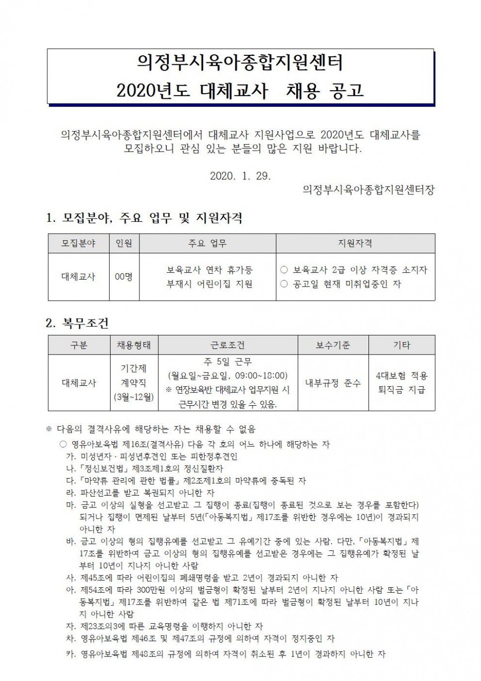 의정부시육아종합지원센터 2020년도 대체교사 채용 공고 페이지 정보 작성자 의정부센터 댓글 0건 조회 3,019회 작성일 2020-01-31 17:37 본문 의정부시육아종합지원센터 2020년도 대체교사 채용 공고문을 게시하오니 많은 지원 바랍니다. 목록 이전글어린이집 장기 미종사자 직무교육 안내 20.02.04 다음글2020년 어린이집 평가 진행일정 20.01.28