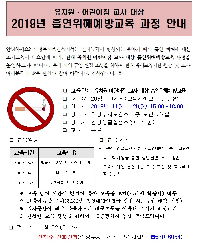 [의정부시보건소]유치원·어린이집 교사 대상 -2019년 흡연위해예방교육 과정 안내