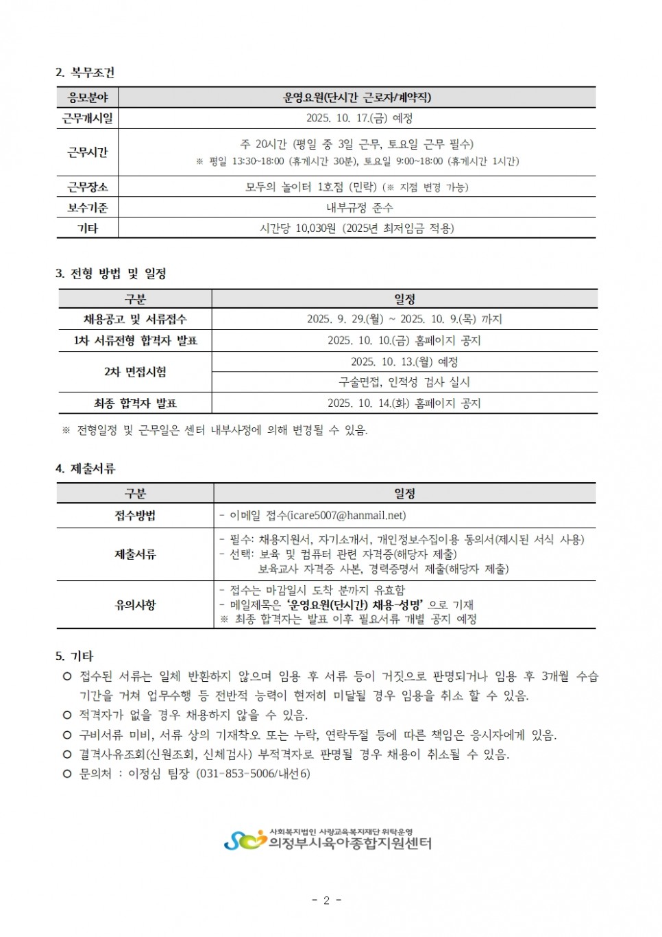 ★ [채용] 의정부시육아종합지원센터 신규직원(운영요원/단시간 근로자) 채용 재공고 페이지 정보 작성자 의정부센터 댓글 0건 조회 572회 작성일 2025-09-29 15:40 본문 ★ [채용] 의정부시육아종합지원센터 신규직원(운영요원/단시간 근로자) 채용 재공고 목록 이전글[2025-03호] 溫-마음 인성 카드뉴스 25.09.29 다음글★ 운영요원(단시간 근로자) 채용 1차 서류 합격자 발표 25.09.26
