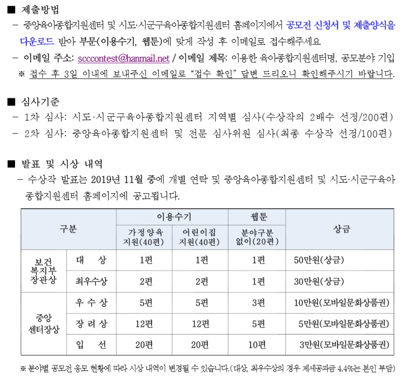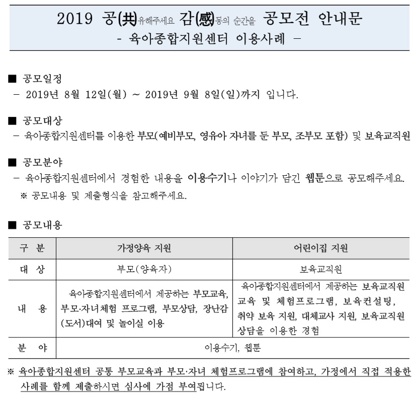 2019 육아종합지원센터 이용사례 공모전 참가 안내 페이지 정보 작성자 의정부센터 댓글 0건 조회 3,470회 작성일 2019-07-29 14:28 본문 2019 육아종합지원센터 이용사례 공모전 참가 안내 목록 이전글2019년 의정부시도서관 <북스타트 책꾸러미 선물> 안내 19.07.29 다음글의정부시육아종합지원센터 직원(운영요원) 채용 공고 19.07.29