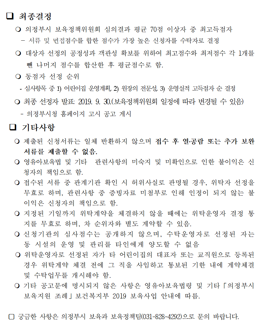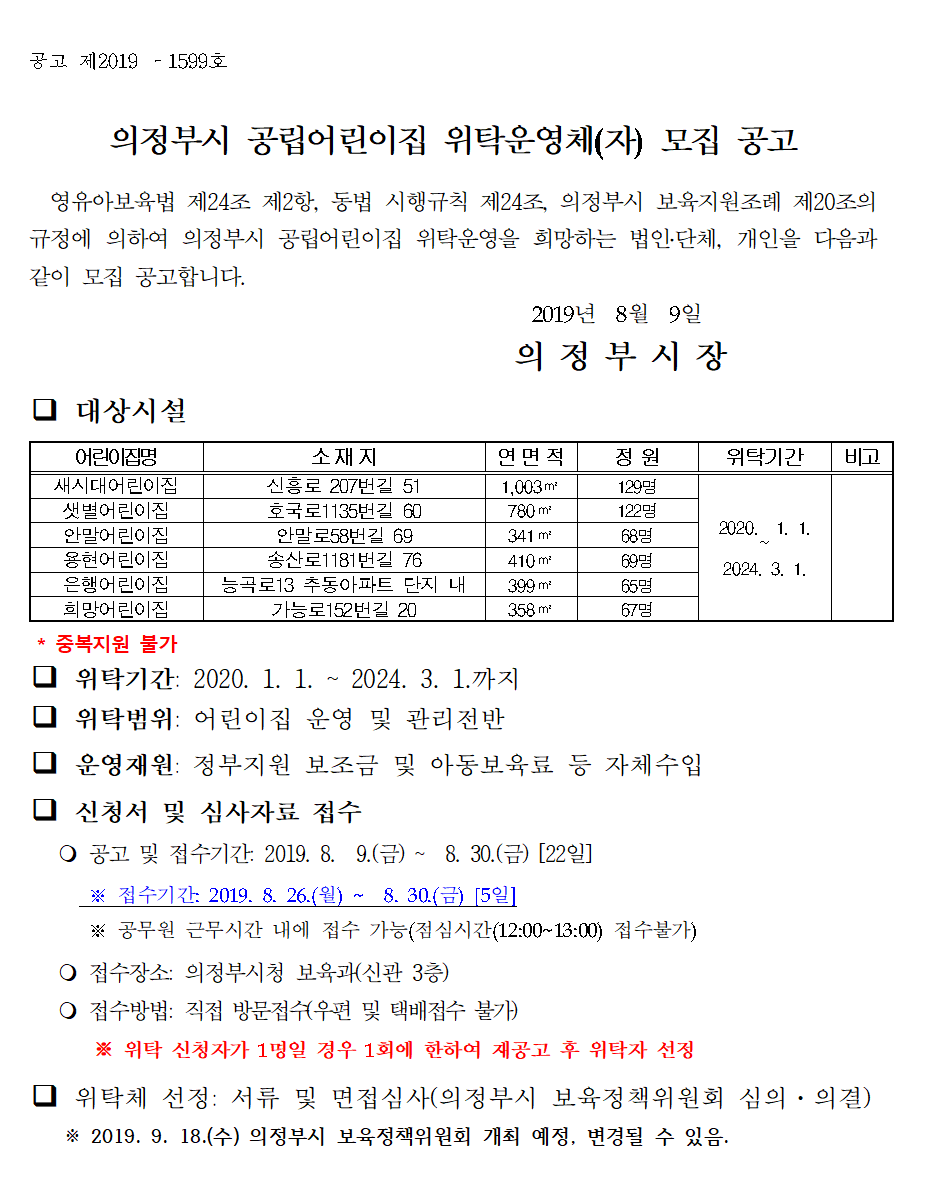 의정부시 공립어린이집 6개소 위탁운영체(자) 모집공고 페이지 정보 작성자 의정부센터 댓글 0건 조회 4,016회 작성일 2019-08-13 16:00 본문 의정부시 공립어린이집 6개소 위탁운영체(자) 모집공고자세한 사항은 첨부파일을 참조해 주세요 목록 이전글제5회 도담아이 사진 공모전 19.08.14 다음글의정부시육아종합지원센터 서류전형 합격자 발표(운영요원) 19.08.12