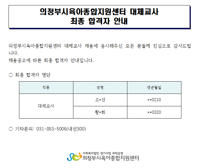 의정부시육아종합지원센터 대체교사 최종 합격자 안내 페이지 정보 작성자 의정부센터 댓글 0건 조회 2,962회 작성일 2019-07-26 15:51 본문 의정부시육아종합지원센터 대체교사 최종 합격자 안내 목록 이전글의정부시육아종합지원센터 직원(운영요원) 채용 공고 19.07.29 다음글2019년도 어린이집 놀이실 신청안내 (3회기차) 19.07.26