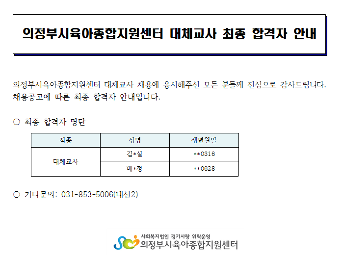 의정부시육아종합지원센터 대체교사 최종 합격자 안내 페이지 정보 작성자 의정부센터 댓글 0건 조회 2,989회 작성일 2019-06-29 13:16 본문 의정부시육아종합지원센터 대체교사 최종 합격자 안내 목록 이전글의정부시 국공립어린이집(민락LH16단지) 보육교직원 채용 공고 19.07.03 다음글의정부시육아종합지원센터 보육전문요원 최종 합격자 안내 19.06.28