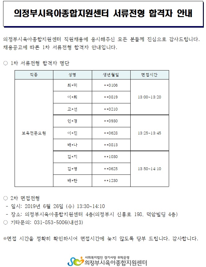 의정부시육아종합지원센터 보육전문요원 서류전형 합격자 안내 페이지 정보 작성자 의정부센터 댓글 0건 조회 2,936회 작성일 2019-06-21 09:27 본문 의정부시육아종합지원센터 보육전문요원 서류전형 합격자 안내 목록 이전글의정부시육아종합지원센터 놀이지도사 서류전형 합격자 안내 19.06.25 다음글의정부시육아종합지원센터 직원 채용 공고(놀이지도사) 19.06.18