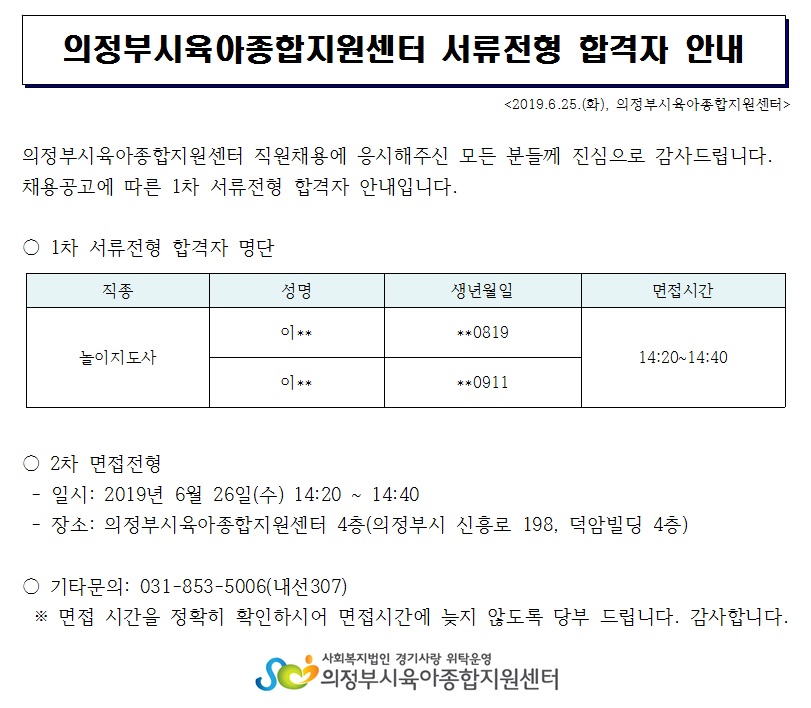 의정부시육아종합지원센터 놀이지도사 서류전형 합격자 안내 페이지 정보 작성자 의정부센터 댓글 0건 조회 2,705회 작성일 2019-06-25 16:23 본문 의정부시육아종합지원센터 놀이지도사 서류전형 합격자 안내 목록 이전글2019년 육아정보지 아자39호(여름호) 배포 어린이집 명단 19.06.26 다음글의정부시육아종합지원센터 보육전문요원 서류전형 합격자 안내 19.06.21