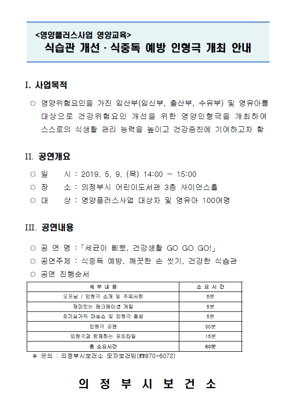 2019년 어린이 영양인형극 개최 알림 페이지 정보 작성자 의정부센터 댓글 0건 조회 3,322회 작성일 2019-04-25 23:51 본문 ※ 자세한 사항은 첨부파일 확인하시고 의정부시보건소로 문의해 주세요 목록 이전글2019년 재인증 1기 평가인증 통과어린이집 안내 19.04.25 다음글2019년 의정부시육아종합지원센터에서 만나는 부모교육(이론) 운영 계획 19.04.25