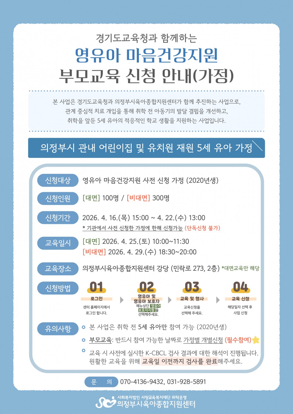 | 대상 | 영유아 마음건강지원 사전 신청 가정 (개인 단독신청 불가) | 장소 | 의정부시육아종합지원센터 강당(민락로 273, 2층) |