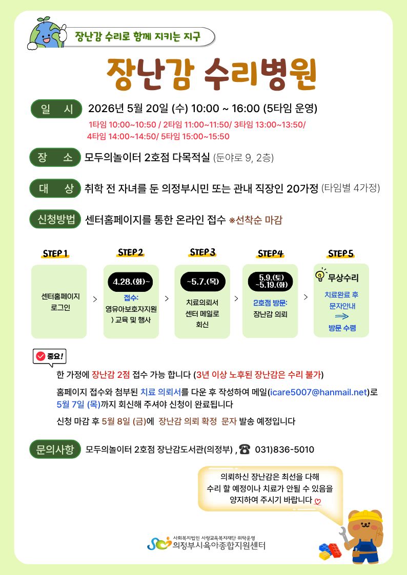 | 기타사항 | ※ 한 가정에 장난감 2개 접수 가능 | 담당자(문의) | 031-836-5010 |