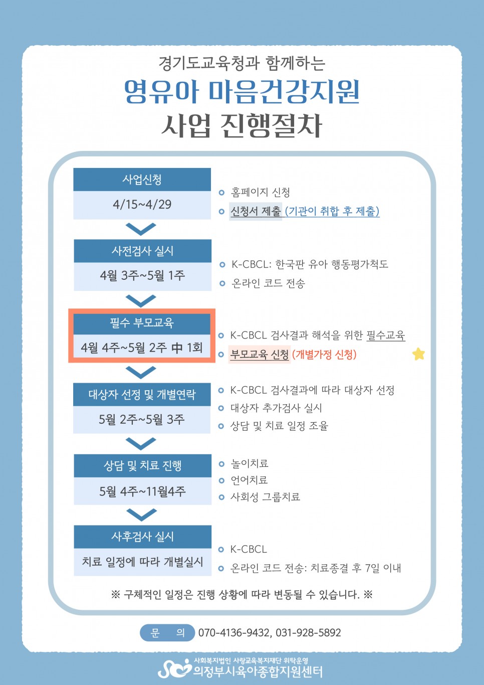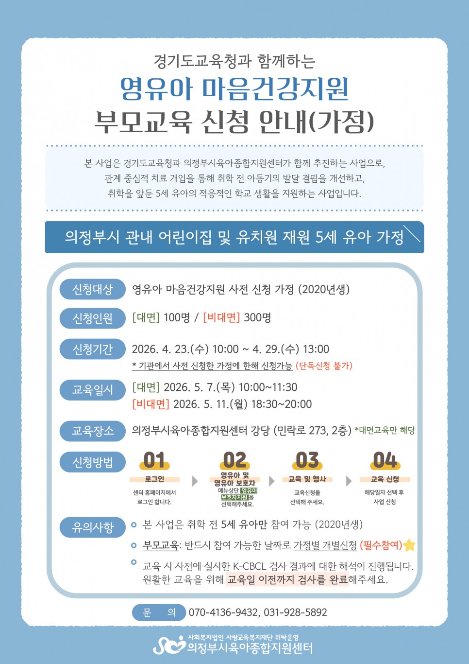 | 대상 | 영유아 마음건강지원 사전 신청 가정 (개인 단독신청 불가) | 장소 | 비대면 ZOOM |