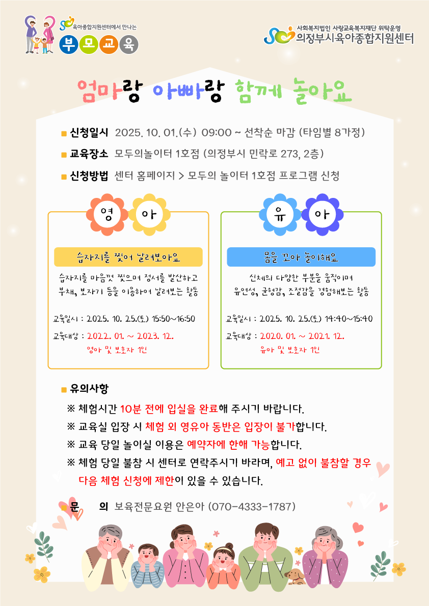 | 활동일시 | (유아) 2025. 10. 25.(토) 14:40~15:40 / (영아) 2025. 10. 25.(토) 15:50~16:50 | ||||||||