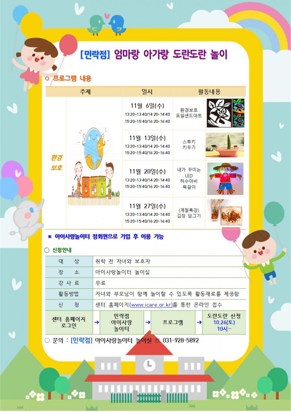 페이지 정보 작성자 의정부센터 댓글 0건 조회 747회 작성일 2019-10-23 13:18 본문 목록상단 노출여부 아니오 주제 환경보호 활동일시 2019. 11. 6. (수) 접수일정 2019-10-26 10:00 ~ 2019-11-04 11:59 강좌명 환경보호 포일샌드아트 대상 취학전 영유아 신청/정원 환경보호 포일샌드아트 목록 이전글스투키 키우기 19.10.23 다음글블링블링 워터볼 19.09.19