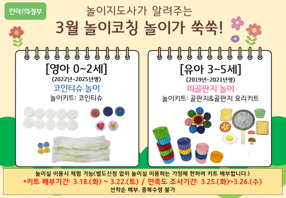 [의정부,민락] 놀이지도사가 알려주는 '3월 놀이코칭 놀이가 쑥쑥' 안내 페이지 정보 작성자 의정부센터 댓글 0건 조회 381회 작성일 2025-03-05 15:05 본문 *별도의 신청 없이 놀이실 이용자에 한해 참여 가능합니다. 목록 이전글[의정부] 대면 4월 부모-자녀 체험 프로그램 이용자 모집(퍼포먼스 미술) 25.03.06 다음글(발달지원) 우리아이발달체크 신청안내(K-CDI 검사) 25.03.05