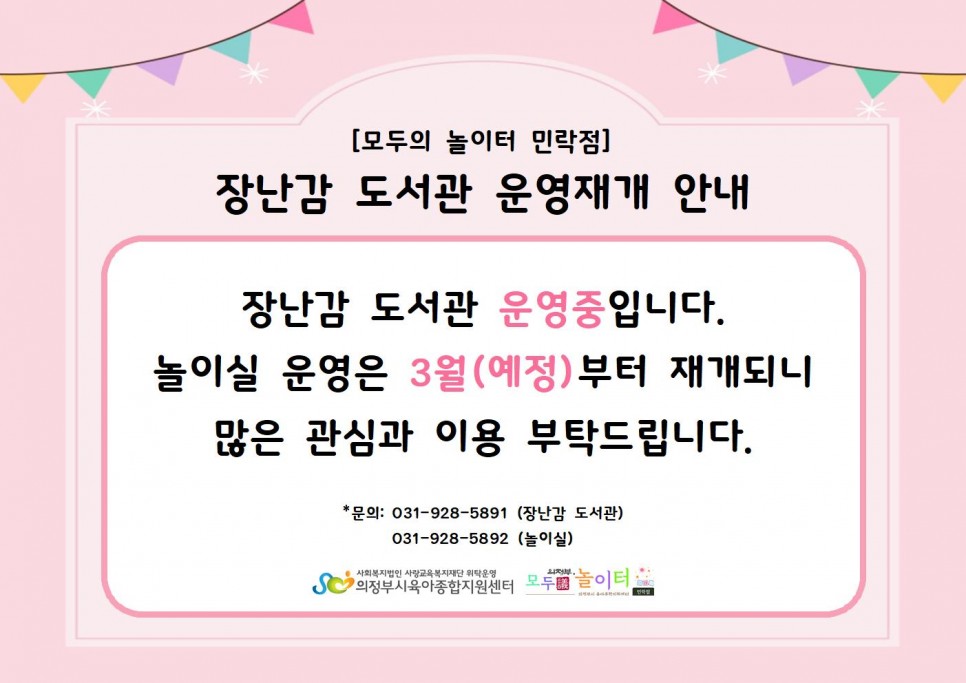 [민락] 장난감 도서관 운영재개 안내 페이지 정보 작성자 의정부센터 댓글 0건 조회 957회 작성일 2025-02-03 10:59 본문 * 놀이실 재개일정은 안전인증 기간에 따라 연기될 수 있으며, 자세한 일정은 추후 공지해드리겠습니다.(운영 중지기간에 대한 회원기간 연장 예정) 목록 이전글[의정부,민락] 놀이지도사가 알려주는 '2월 놀이코칭 놀이가 쑥쑥' 안내 25.02.03 다음글[의정부] 2월 부모-자녀 체험 프로그램 모집결과 안내 25.01.22