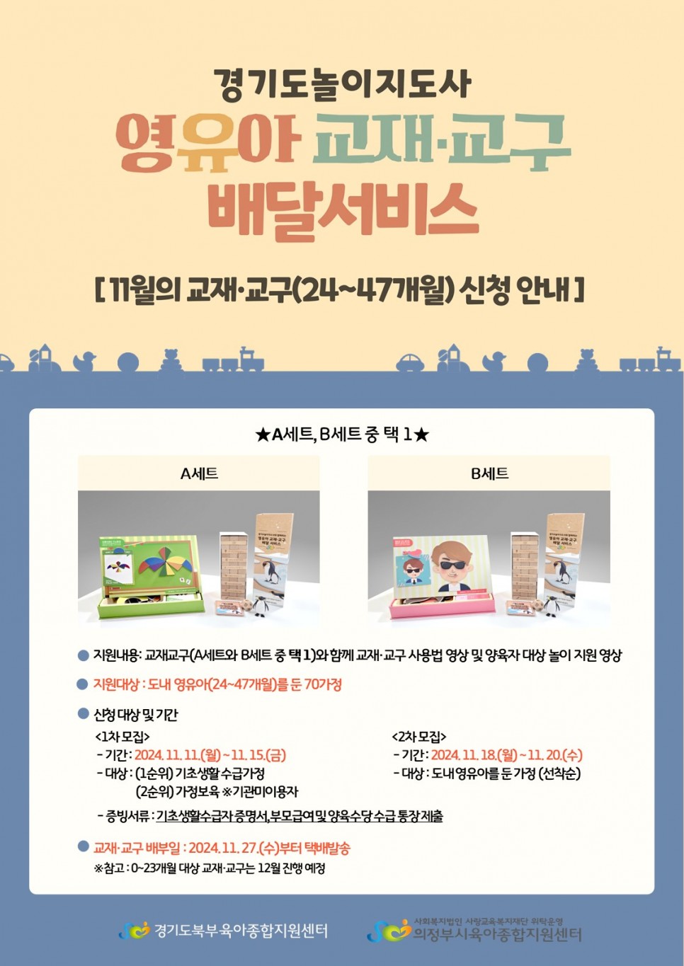(놀이지도) 11월 영유아 교재·교구 배달 서비스 신청안내(유아) 페이지 정보 작성자 의정부센터 댓글 0건 조회 923회 작성일 2024-11-07 18:26 본문 안내문 꼼꼼히 확인 후 신청 바랍니다. *신청절차프로그램 신청 후 -> 증빙서류제출 링크 클릭하여 작성(개인정보동의서 함께 첨부) 목록 이전글2024년 12월 가정양육지원사업 뉴스레터 24.11.14 다음글[의정부,민락] 놀이지도사가 알려주는 11월 '놀이가 쑥쑥' 놀이키트 배부 안내 24.11.05