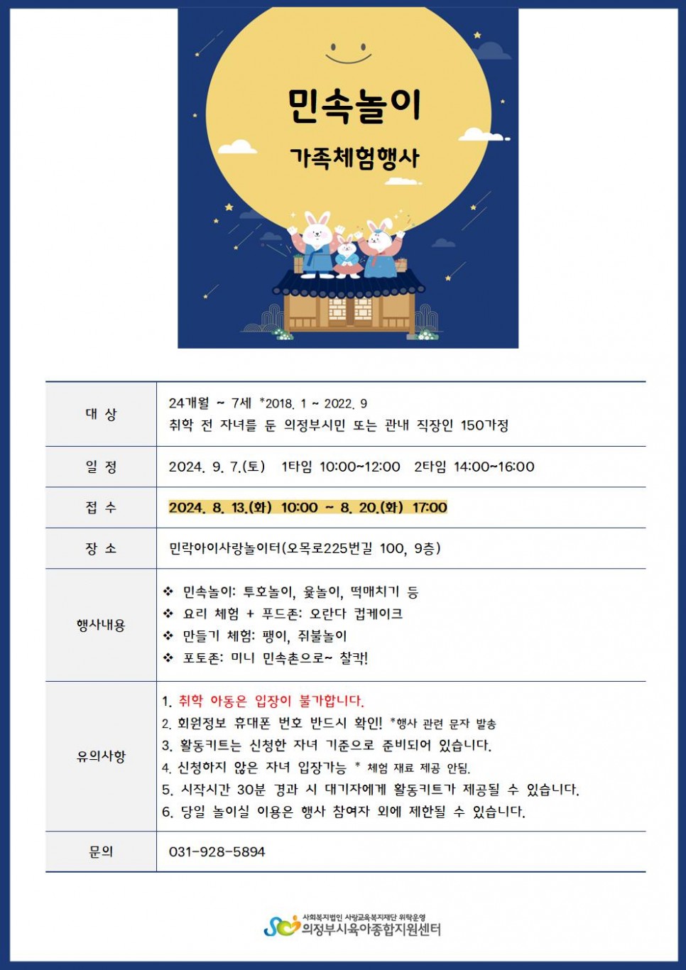 [행사] 가족체험행사 '민속놀이' 모집 안내 페이지 정보 작성자 의정부센터 댓글 0건 조회 814회 작성일 2024-08-06 11:47 본문 해당 일정과 내용을 꼼꼼히 확인하신 후 신청 부탁드립니다.^^ 목록 이전글아이사랑놀이터 9월 휴관안내 24.08.06 다음글[민락] 부모-자녀 체험 프로그램 8월 특강 모집결과 안내(오로로 그림책 놀이, 뮤직아이) 24.08.06