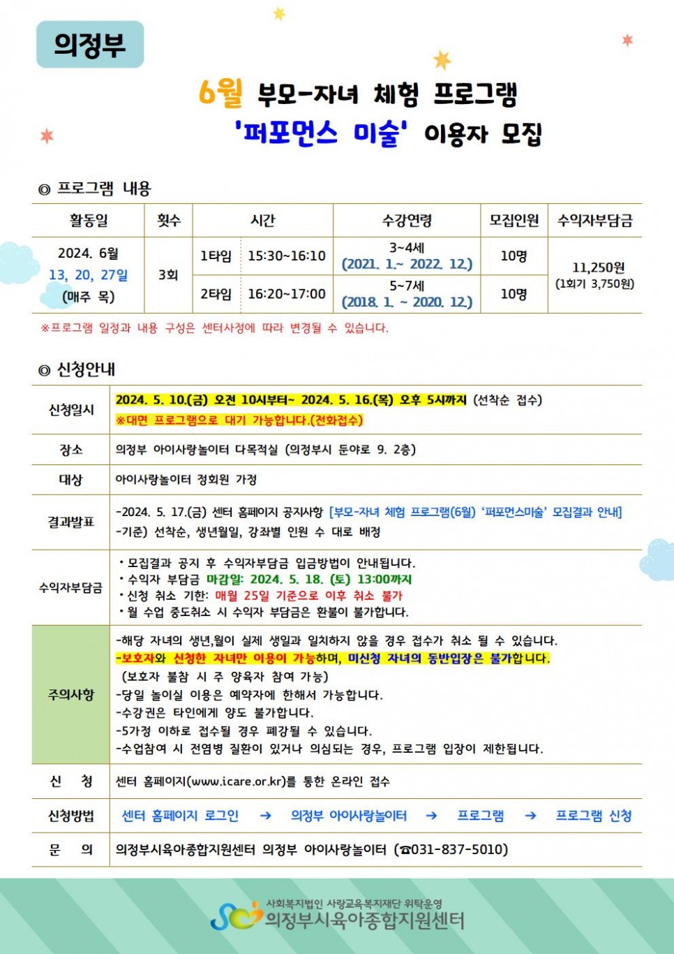 [의정부] 대면 6월 부모-자녀 체험 프로그램 이용자 모집(퍼포먼스 미술) 페이지 정보 작성자 의정부센터 댓글 0건 조회 1,289회 작성일 2024-04-23 11:49 본문 * 수업 요일, 시간 등 안내문을 정확하게 확인 후 신청해주세요. 목록 이전글[민락] 대면 6월 부모-자녀 체험 프로그램 이용자 모집(요술책상) 24.04.23 다음글[공통부모교육] 5월 클로버 부모·자녀 체험활동 참여 안내 24.04.22