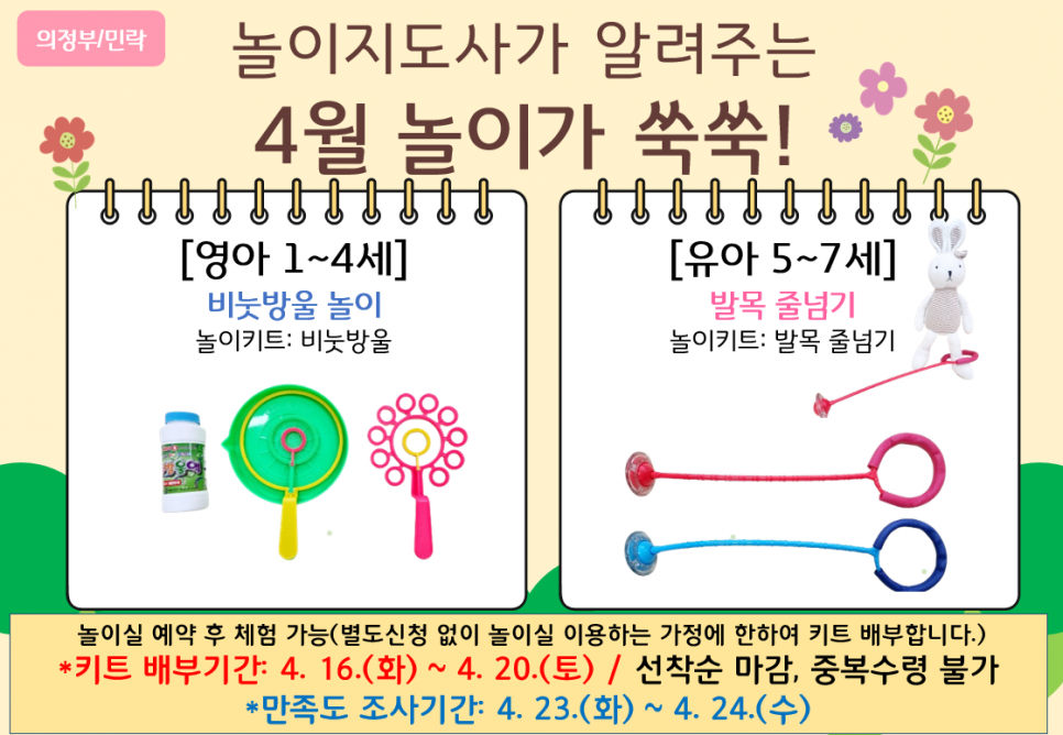 [의정부,민락] 놀이지도사가 알려주는 4월 '놀이가 쑥쑥' 놀이키트 배부 안내 페이지 정보 작성자 의정부센터 댓글 0건 조회 1,222회 작성일 2024-04-02 13:36 본문 별도의 신청을 진행하지 않으며, 해당 기간 내 아이사랑놀이터 놀이실 예약 후 키트활동이 가능합니다. 목록 이전글[행사] 신나는 어린이날 모집 안내 24.04.02 다음글[특화사업] 4월 뛰.놀.자. 프로그램 안내 24.04.01