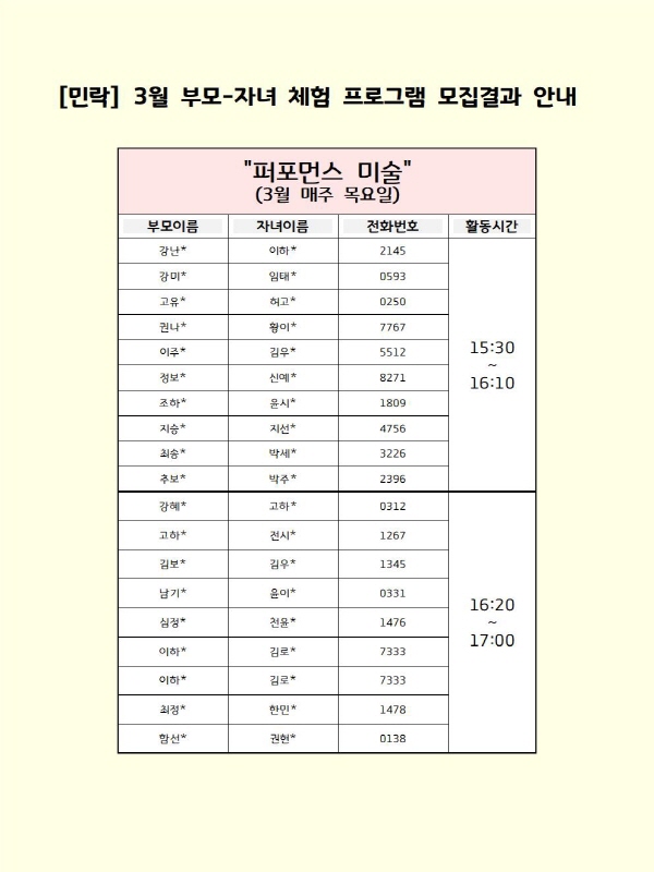 [민락] 3월 부모-자녀 체험 프로그램 모집결과 안내