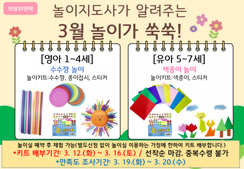 [의정부,민락] 놀이지도사가 알려주는 3월 '놀이가 쑥쑥' 놀이키트 배부 안내 페이지 정보 작성자 의정부센터 댓글 0건 조회 1,178회 작성일 2024-03-05 15:21 본문 별도의 신청을 진행하지 않으며, 해당 기간 내 아이사랑놀이터 놀이실 예약 후 키트활동이 가능합니다. 목록 이전글[민락] 2024년 3월 장난감 도서관 신규 장난감 입고 안내 24.03.06 다음글[특화사업] 3월 뛰.놀.자. 프로그램 안내 24.03.04