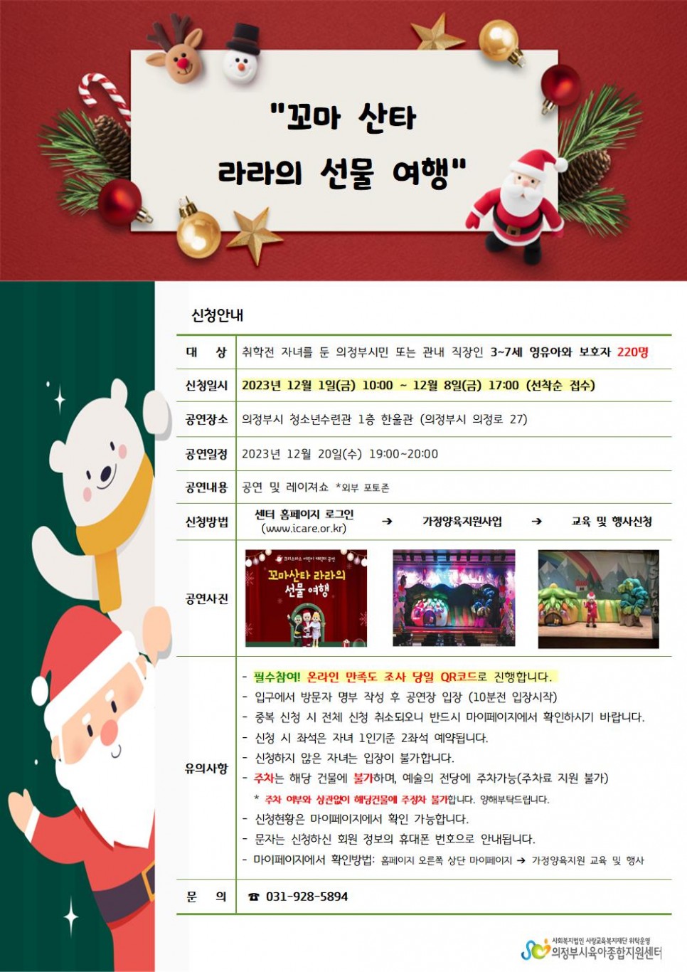 [행사] 산타공연 "꼬마산타 라라의 선물여행" 모집 안내 페이지 정보 작성자 의정부센터 댓글 0건 조회 1,540회 작성일 2023-11-21 14:21 본문 주의사항을 꼼꼼하게 확인하신 후 신청해 주세요~ 목록 이전글가정양육지원사업 23년 하반기 만족도 및 2024년 요구도 조사 실시 23.11.24 다음글[의정부, 민락] 놀이실이용시간 일부 제한 안내 23.11.17