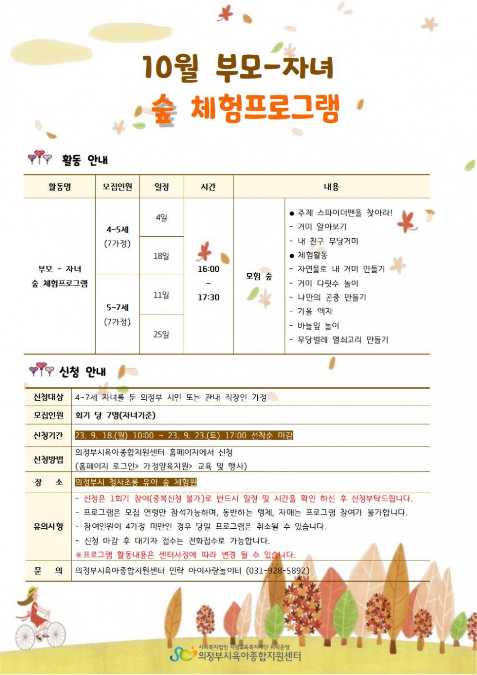 [특화사업] 10월 부모-자녀 숲 체험프로그램 안내 페이지 정보 작성자 의정부센터 댓글 0건 조회 1,261회 작성일 2023-09-21 11:09 본문 ※ 체험활동 시간이 변경되었습니다. 확인하신 후 신청접수 부탁드립니다. 목록 이전글[10월 부모교육] 책 좋아하는 아이로 성장 (대면교육) 23.09.21 다음글2023년 10월 가정양육지원사업 뉴스레터 23.09.19