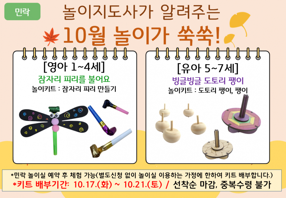 [민락] 놀이지도사가 알려주는 10월 '놀이가 쑥쑥' 놀이키트 배부 안내 페이지 정보 작성자 의정부센터 댓글 0건 조회 1,298회 작성일 2023-10-04 14:41 본문 별도의 신청을 진행하지 않으며, 해당 기간 내 민락 아이사랑놀이터 놀이실 예약 후 키트수령 가능합니다. 목록 이전글[민락] 2023년 10월 장난감 도서관 신규 장난감 입고 안내 23.10.04 다음글[의정부] 2023년 10월 장난감 도서관 신규 장난감 입고 안내 23.10.04