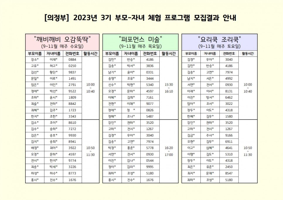 [의정부] 2023년 3기 부모-자녀 체험 프로그램 '깨비깨비 오감뚝딱, 퍼포먼스 미술, 요리쿡 조리쿡' 모집결과 안내