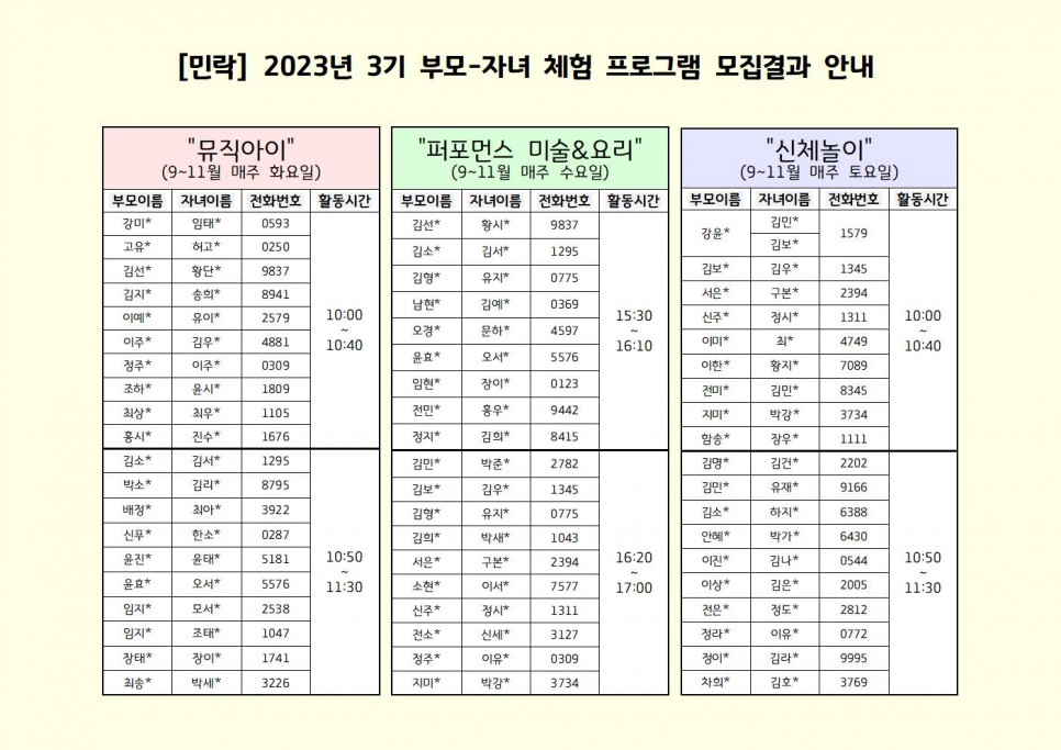 [민락] 2023년 3기 부모-자녀 체험 프로그램 모집결과 안내(뮤직아이, 퍼포먼스 미술&요리, 신체놀이)